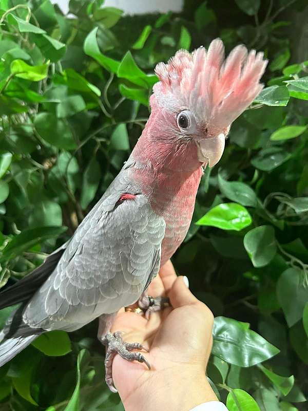 The colorful Inca cockatoos for sale are predominantly pink and white and easily recognizable. These striking birds have broad pink patches around their necks and on their undersides. A bright pink is often visible beneath their white wingtips.