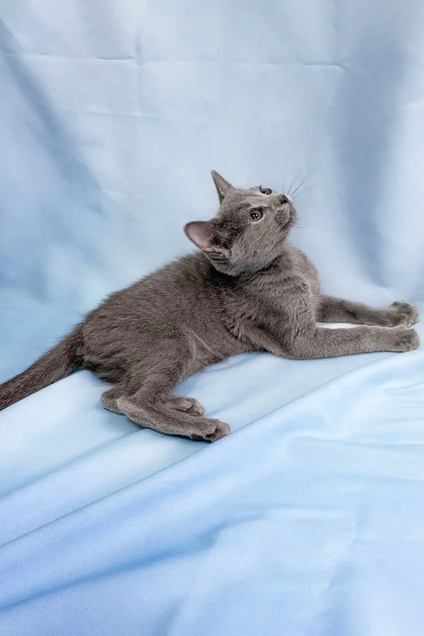 Buy a Blue Russian cat. I am a 12-week-old Russian Blue kitten with a fluffy, double-layered blue coat that shimmers like moonlight and the brightest green eyes you’ve ever seen. They say I have a „smiling“ face, but I’m only this happy when I imagine a life by your side. I may be small now, but I will grow into a graceful beauty weighing approximately 2.3 to 4.5 kg. I also come from rare bloodlines and carry all the elegance, grace, and quiet charm that make the Russian Blue one of the most popular and noble breeds in the world. If you dream of a cat with gentle loyalty and quiet confidence, I may be the one for you.