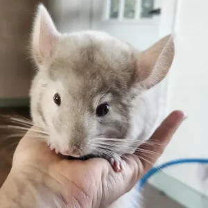 This young male has been handled daily, ensuring he’s socialized, calm, and accustomed to gentle human interaction. He’s thriving on a balanced diet of premium Chinchilla pellets, hay, and occasional treats, ensuring healthy fur and good energy levels. Curious and active, he enjoys exercise time and dust baths to keep his coat soft and clean.
