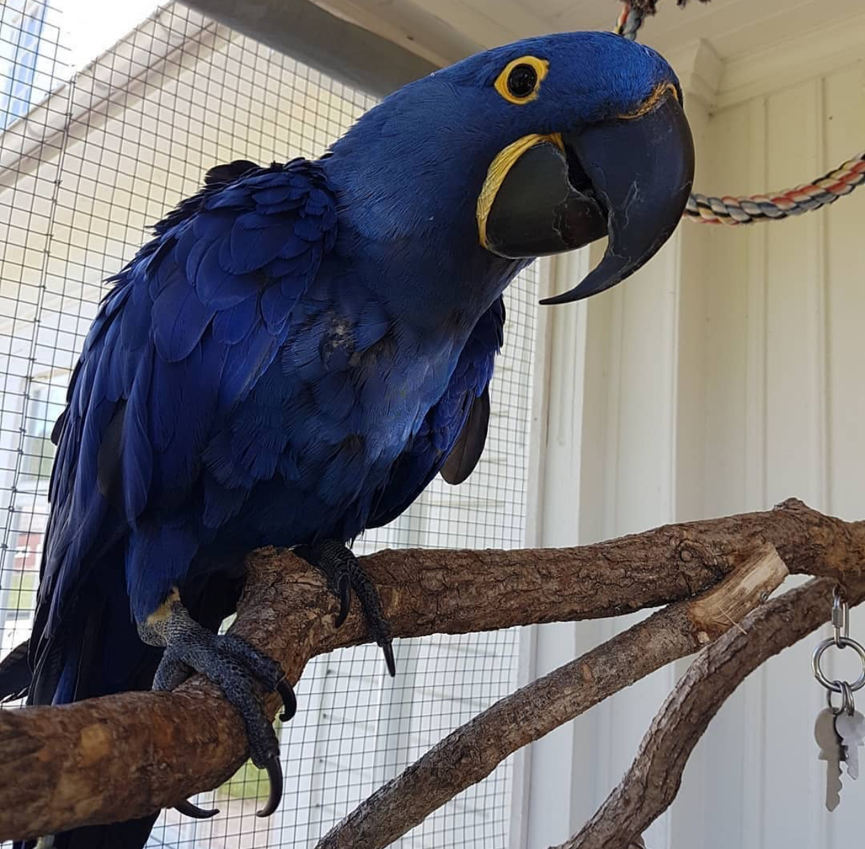 A very large cage is ideal for a macaw, providing ample space for playing and exercising. Cages made of stainless steel or powder-coated steel are well-suited. To keep the bird healthy and hydrated, food and water dishes must be filled at all times. Toys and treats are essential for the bird’s happiness. Offer the bird a bath in shallow water at least once a week, or more often, or mist it with water. Two to three hours of exercise per day are necessary. Allow the bird to spread its wings and flap them to exercise its wing muscles. Let the bird walk and climb to exercise its legs and feet, and allow it to chew on toys to exercise its jaw muscles.