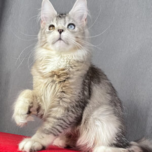 Buy XXL Maine Coon Kittens. I am a Maine Coon cat and was born to be a very special person in your life. With my rare black-ticked white fur and my charming, quirky eyes, I’m already turning heads at just four months old. But I’m more than just my looks. I have a gentle nature, a playful curiosity, and a calm emotional intuition that helps me connect with the people I love. My fluffy, raccoon-like tail wags proudly, my full chin gives me a bold, majestic look, and when something moves, I’m quick to pounce. I’m made for adventure and cuddling, all in one.